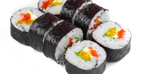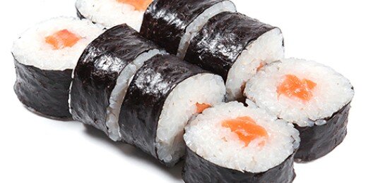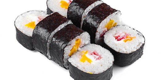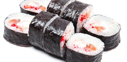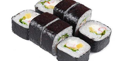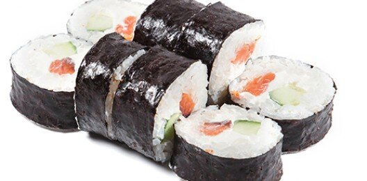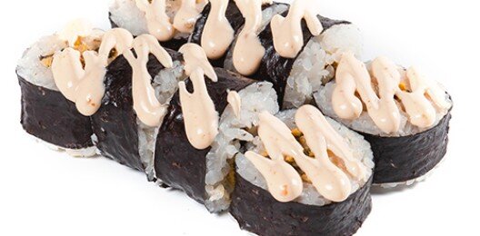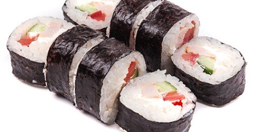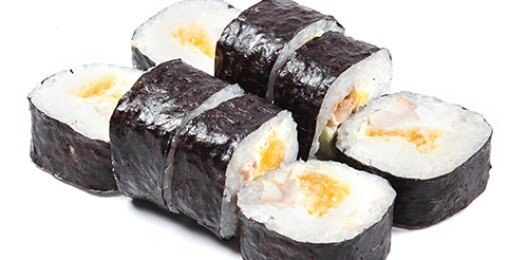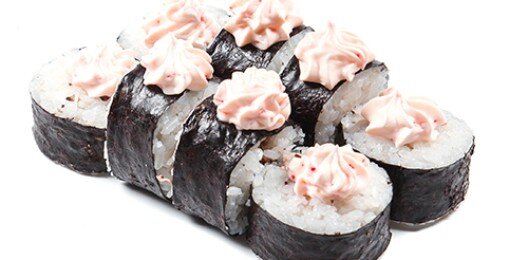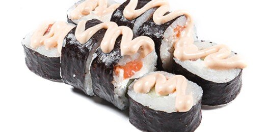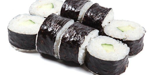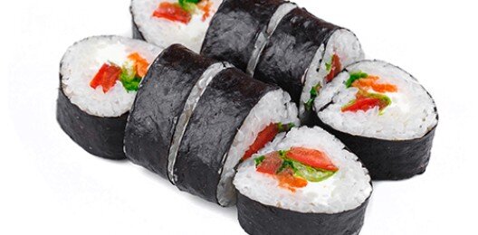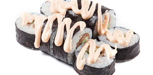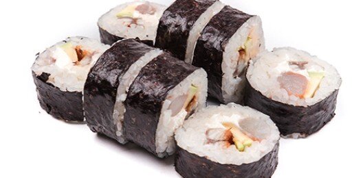 Угорь копчёный, сыр творожный, огурец, кунжут, рис, нори
